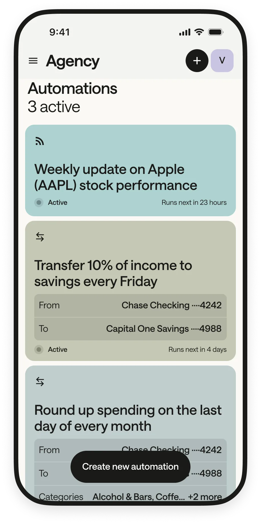 You can create rules to auto-categorize transactions, round up purchases into savings, flag recurring charges that spike, split expenses with a partner, and more. Rules can be set up through any connected agent or through Agency directly.