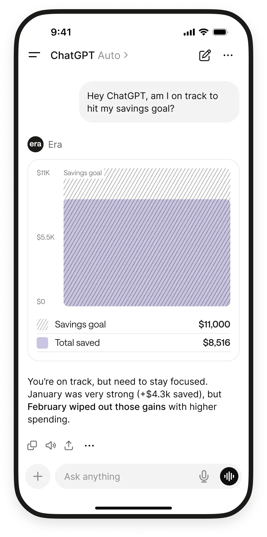 That's the point. Context is agent-agnostic. Your financial data, rules, memory, and automations live in Era — not in any single assistant. Switch from Claude to ChatGPT to whatever comes next. Everything carries over.